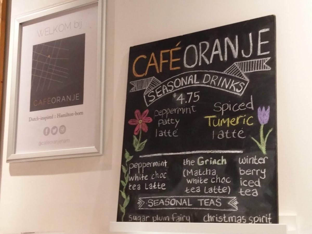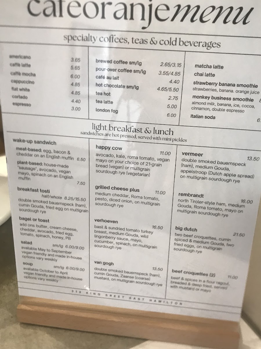 Café Oranje, located at 312 King St E, Hamilton, ON L8N 1C2, offers a diverse menu that caters to various tastes, from specialty coffees to light breakfast and lunch options. If you're a coffee enthusiast, you’ll enjoy their wide range of specialty coffees, including the classic Americano, Caffè Latte, Caffè Mocha, Cappuccino, and Flat White. Each coffee is brewed to perfection, promising a rich and flavorful experience to kick-start your day.